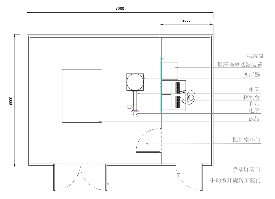> 屏蔽室整體尺寸:長7米×寬5米×高3米